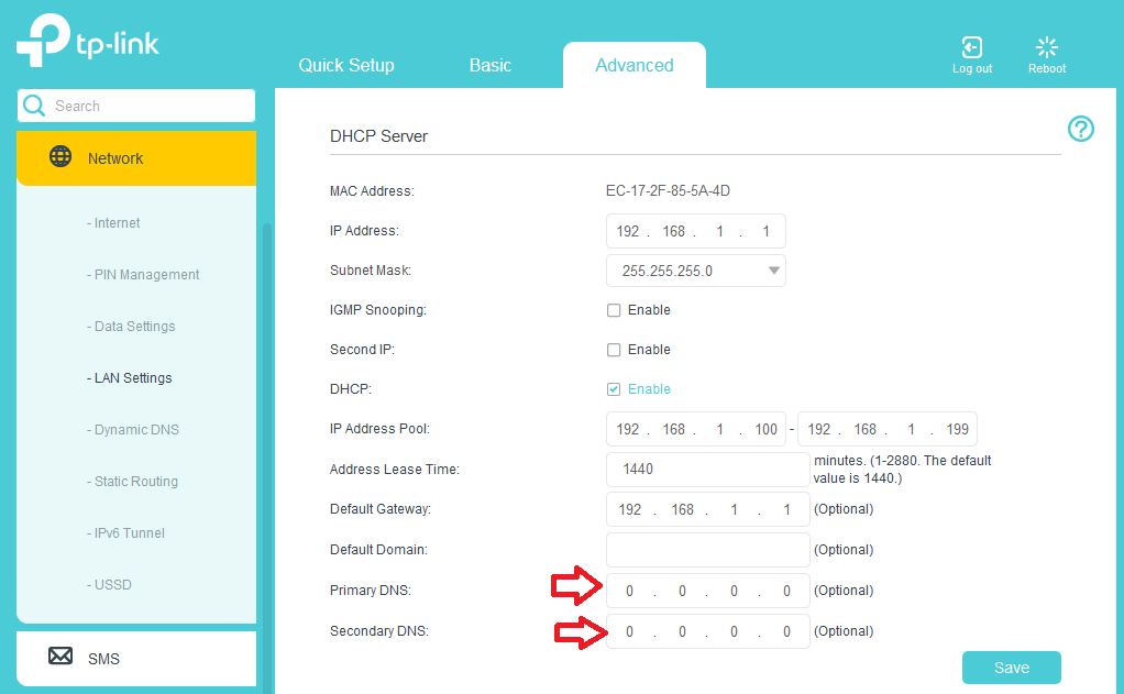 Přímo v nastavení routeru jsem našel v záložce Síť/Nastavení LAN/ Primární DNS 0.0.0.0 - toto tedy změnit?