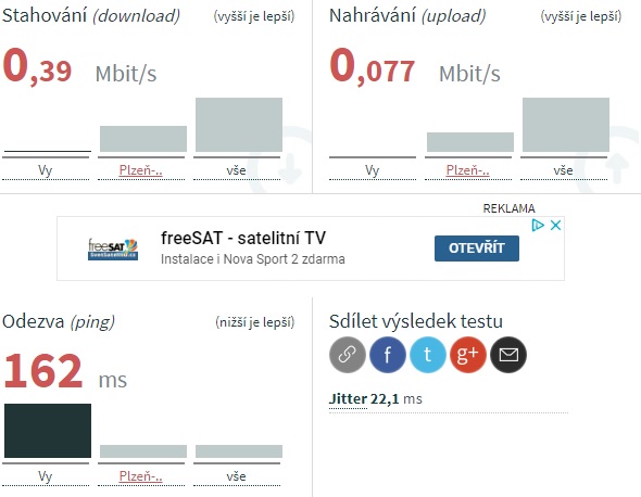 Připojení by mělo být 15 Mbit/s. Naměřeno mám mnohem méně. (PS: na fotce je zatím nejmenší ping za dnešek )