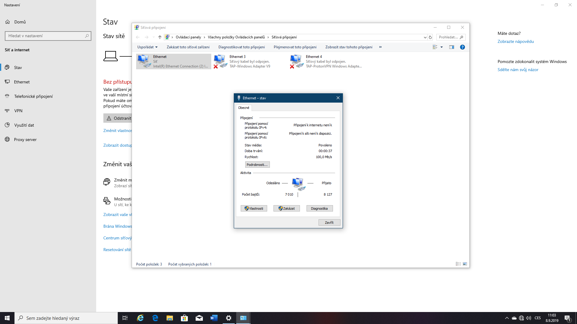 Dobrý den, už jsem tu jednou psal stejný problém, ale internet vždy naskočil, tak jsem to dál neřešil. Teď už vím, v jakém případě přestane internet fungovat. Chybová hláška je vždy stejná, " Adresa proxy serveru sítě nebyla nalezena". Během pár minut, nebo při restartování modemu vše naskočí do normálu, ale jen v případě, že je pc Zapnuté. Jakmile pc zapnu, internet do pár minut funguje, při restartování modemu do pár sekund. Když pc vypnu, internet přestane fungovat a bliká oranžově kontrolka DSL a nemám k internetu přístup. Mám internet Zyxel VDSL a do pc jde kabel DSL a přes modem v nastavení Wireless mám zapnutou Wi-Fi, kterou používám pro mobil nebo notebook, takže když vypnu pc nemám přístup k internetu.Tento problém nastal zřejmě při používání VPN tunelu v programu ProtonVPN, od té doby to zřejmě blbne. V nastavení internetu jsem si nehrál nebo aspoň tuším, že jsem si s tím nehrál, muselo se to nastavit samo nebo někdo z rodiny tam něco nastavil a neví o tom. Jaké screeny mám poslat, aby se ten problém podařilo zjistit? V internetu se moc nevyznám.