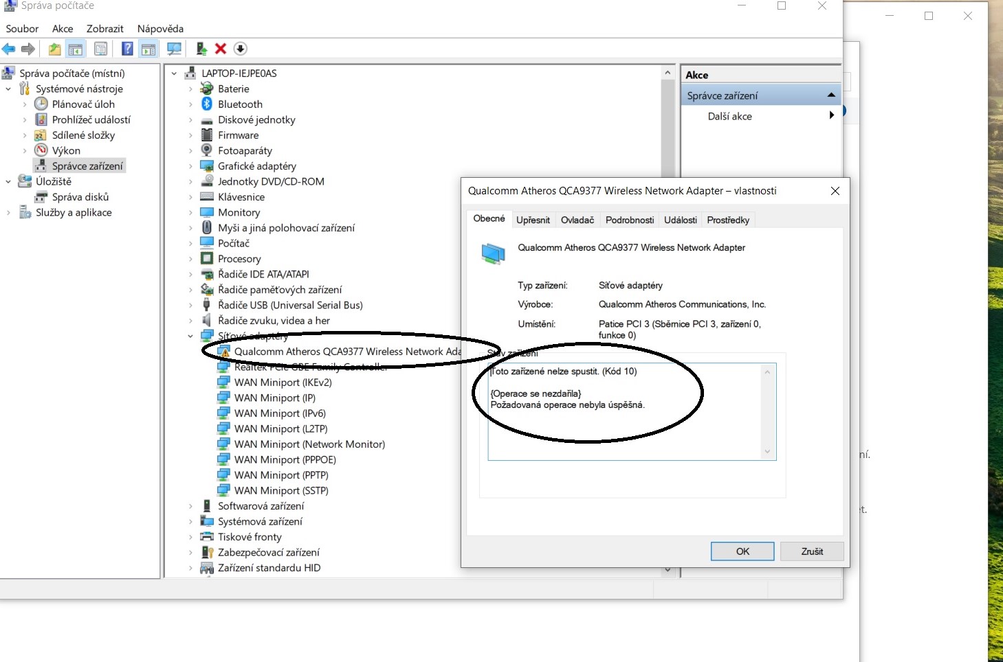 prosím o radu s připojením k wifi. Od včera mi nejde připojit k wifi, ani mi to žádnou wifi v "Síť a internet" nenabízí (viz obr). A mezi síťovými adaptéry mám u "Qualcomm Atheros..." vykřičník, a když na něj kliknu, píše to, že zařízení nejde spustit (viz druhý obr.). Prosím o radu, jak se zase dostat na wifi. Jsem bezradná...