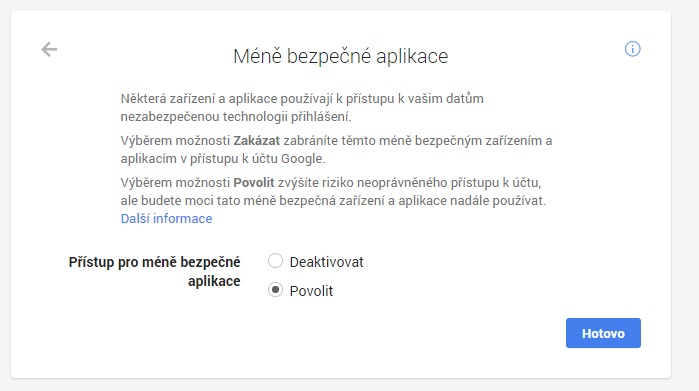 Jo zde jsem musel povolit používání méně bezpečných aplikací.