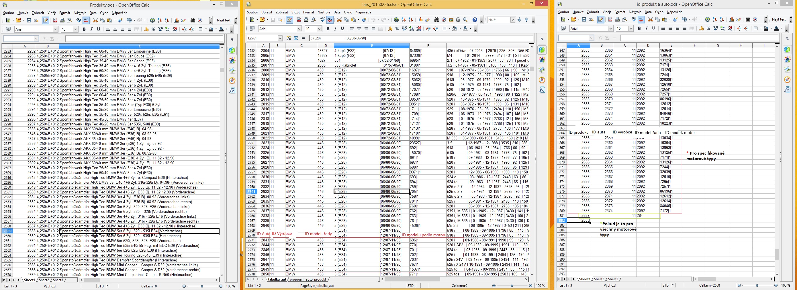 Zdravím, nenapadá někoho způsob jak roztřídit asi 30 000 položek produktů dílů aut podle značky modelu a typu nějak rychleji než jeden po druhém vypisovat?? Přiřazuji k ID produktu ID automobilu ID modelu a ID typu. Pokud existuje nějaká rychlejší cesta než všechno manuálně hledat a vypisovat byl bych moc rád za každou radu nebo u toho ztrávím mládí. Děkuji za odpověd.