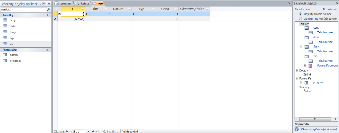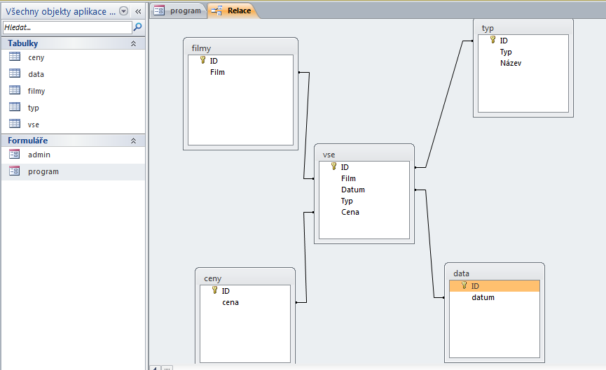 Musím vytvořit aplikaci na libovolné téma do školy - v MS accessu. Vybrala jsem si program kina. Vše je ok, až na relace - nevím, jak by měly vypadat, aby vše fungovalo