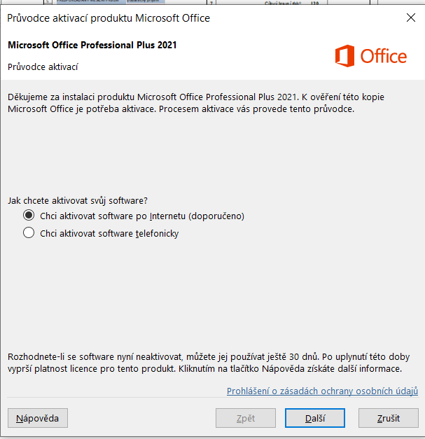 Tak už jsem to vyřešil. Antivir ESET blokoval aktivaci Office přes internet. Vypnul jsem ho a aktivace proběhla.