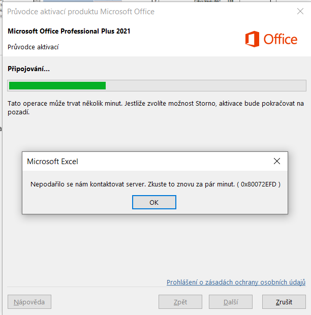 Spustím aktivaci Office po internetu - viz první obrázek, a přibližně po jedné sekundě to ukáže chybu - viz druhý obrázek. A internet funguje na PC. To by tedy neměl být můj server.
