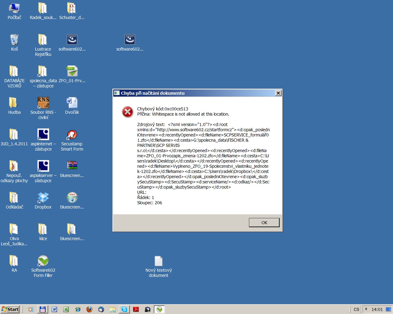 Při spuštění programu se objeví hlášení, že není možné otevřít dokument (viz bug 2 v příloze). Formuláře zfo např. obchodního rejstříku jdou otevírat normálně. Reinstalace Filleru nepomohla. PC: Win 7 Home Premium 64bit.