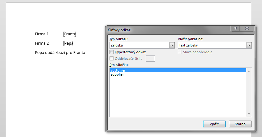 To sem zkusil a nefunguje to tak, jak potřebuju. Když přepíšu původní informaci v hranatejch závorkách, tak se nic nestane a odkazovaný pole se neupraví. Zkoušel sem pak vložit novej odkaz ale už tam ta záložka neni na výběr. Potřebuju abych jednou navkládal ty odkazy x-krát do různejch odstavců, a pak měnil jen ty zdrojový pole podle firmy, adresy atd.