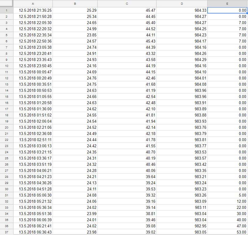 potřebuji poradit. Nějakou dobu doma v rámci svého internetu věcí provozuji vlastní sestavenou a naprogramovanou meteostanici (WeMos D1 Mini; teploměr, vlhkoměr a tlakoměr BME280; luxmetr BH1750). Meteostanice sbírá data ze senzorů (teplota, vlhkost, tlak, světlo) a odesílá je do Google Tabulek, kde se ukládají do listu "Data" a rozřazují se do jednotlivých sloupců, jak je vidět v přiloženém obrázku. Nad tímto listem pak stavím grafy pro jednotlivé hodnoty, ovšem má to jeden drobný problém: vejdou se tam data třeba za celý rok a ta se zároveň kreslí do již zmíněných grafů, což nechci, protože v těch grafech je potom takový guláš, že se v tom nejde vyznat. Proto bych vás chtěl poprosit, jestli někdo nevíte o nějakém skriptu, který by data starší dejme tomu 3 dny automaticky smazal. Ano, ta data bych mohl mazat ručně, ale přijde mi to dost neefektivní.