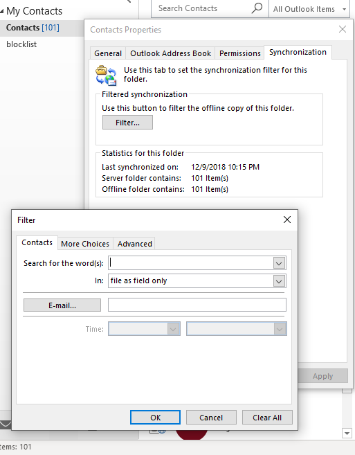 Potřebuji synchronizovat kontakty a kalendář mezi mobilním telefonem a počítačem s komplexním poštovním klientem Microsoft Outlook (placená verze Office 365). Bohužel, z neznámého důvodu se mi nedaří synchronizovat všech 2547 uložených kontaktů s lokálně instalovaným Outlookem. Problém se týká výhradně konktaktů, protože úkoly, kalendář, zpracování ... se vše synchronizuje (ve verzi 16.0.11.11001.20091 byla chyba) k plné spokojenosti.