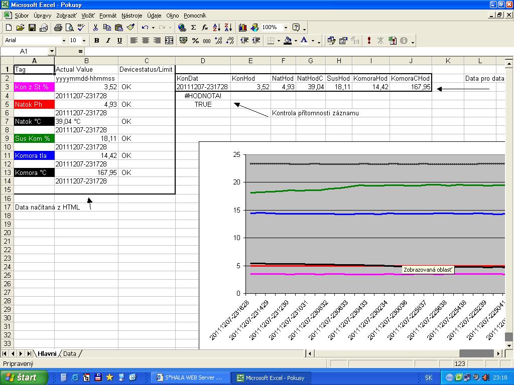 Zdravím. Potrebujem pomôcť z jedným problémom s ktorým si neviem rady. Trochu ho opíšem. Mám prístroj na meranie veličín, ktorý je zapojený v sieti s PC a cez webové rozhranie IE mi zobrazuje na PC namerané hodnoty. Týchto šesť hodnôt mi v dvojminutových intervaloch refrešuje, takže každe dve minúty mám na monitore aktuálne hodnoty.Potreboval by som z tých údajov spraviť graf na ktorom by sa mi zobrazovali krivky z nameraných hodnôt. Pokúšam sa to robiť pomocou excelu, problém je však v tom, že tie hodnoty v ňom sa mi zobrazujú iba aktuálne. Potrebujem, aby sa mi každá nová hodnota ktorá sa prenesie z IE uložila do novej bunky pod seba a potom z toho spraviť graf, ktorý by sa tiež aktualizoval pri vložení nových dát. Ak by niekto vedel poradiť, privítam každé riešenie.