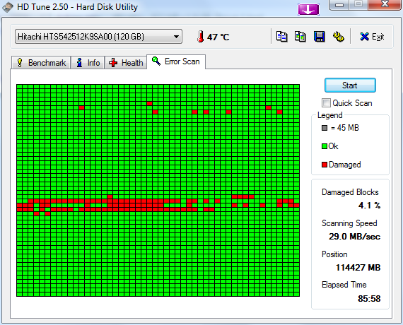 https://memtest.org/download/v6.10/mt86 ... taller.exe Vadná RAM (červeně jsou označeny vadné adresy RAM): HDTune (záložka Error Scan, nezatrhávat Quick Scan):