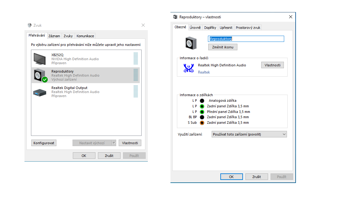 mám problém, nemůžu v PC přepínat mezi sluchátky a reproduktory, musím vždy vysunout kabel od sluchátek, pokud chci poslouchat z reproduktoru. V nastavení ve zvuku mam totiž kolonku "reproduktory" na které je jak zadní, tak i přední zdířka na PC, viz foto. Nevíte někdo jak to rozdělit, aby každá zdířka měla svojí kolonku "sluchátka" a "reproduktory" a mohl bych to přepínat?