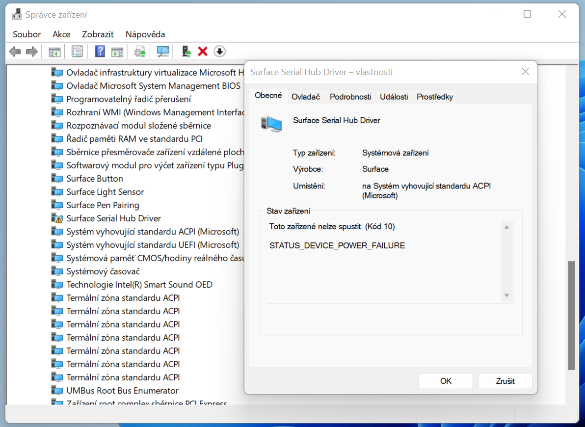Zdravím, na mém laptopu přestala fungovat klávesnice a touchpad. Podíval jsem se do správce zařízení a u Surface serial hub driver je vykřičník. Zkušel jsem aktualizovat driver, odinstalovat driver a restartovat pc ale také nic. Dále jsem zkusil přeinstalovat win, ale také nepomohlo. Stalo se to při restaru pc, jednou jsem ho restartoval a najednou to nešlo. Také není vidět ikona stavu baterie, ani v nastavení ani ve správci zařízení není ikona baterie. chová se to jako by to bylo připojeno napevno k síti. Už jsem si myslel že to bude chyba hw, ale v UEFI jak klávesnice ta touchpad normálně funguje. Neměl jste někdo stejný problém ? Už jsem toho zkusil hodně a nevím jak dál. díky.