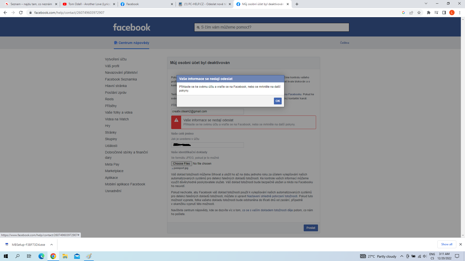 Je mi jasné, že mě většina lidí odkáže na facebook podporu, ovšem nikde jsem nenašel relevantní kontakt. Nelze ani napsat žádný ticket. Jediné k čemu jsem po hodinách pátrání došel bylo, že si mám nahrát nějaký doklad (ID) přes jejich formulář. To jsem udělal, ovšem formulář nelze odeslat. Viz. příloha. Na telefonu už vůbec ne, to jim úplně spadne.