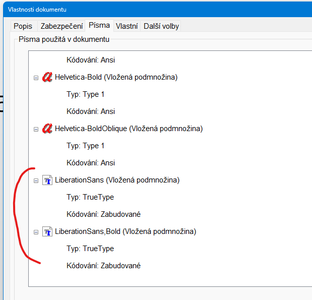 Kdyz dam v Adobe Readeru Vlastnosti dokumentu, tak me to zobrazi seznam fontu. Ten "spatny" je mezi nima. To znamena, ze je soucasti?