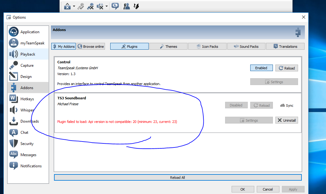 Mám nainstalované teamspeak. Chtěl jsem si stáhnout TS3Soundboard Plugin kvůli tomu že jsem chtěl dělát DJ (týpka kterej pouští písničky v Music Roomce) na jednom TS Serveru. Všechno jsem stáhl tak jak jsem měl podle tutoriálu ale píše mi to tenhle error. Nemá někdo zkušenosti? Nevíte co mám dělat? Zkoušel jsem znovu nainstalovat jak tsko tak i ten program ale nepomáhá....