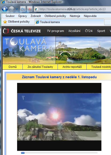 Jen upřesním můj problém, stránka se zobrazuje tak jak má, to nemá chybu, chyba nastane až tehdy, když kliknu na to video tou "pěstičkou s prstíkem" a kliknu v domnění, že se spustí přehrávání videa. Bohužel obrázek, tedy ten modrý čtvereček, viz. přiložené foto s nápisem "Toulavá kamera, spustit video a šipka" zmizí a nic se neděje. Viz můj první obrázek v této debatě. Když na tom PC spustím Operu, tak se to normálně přehraje, přehrávače WMP i KMP normálně přehrávají.