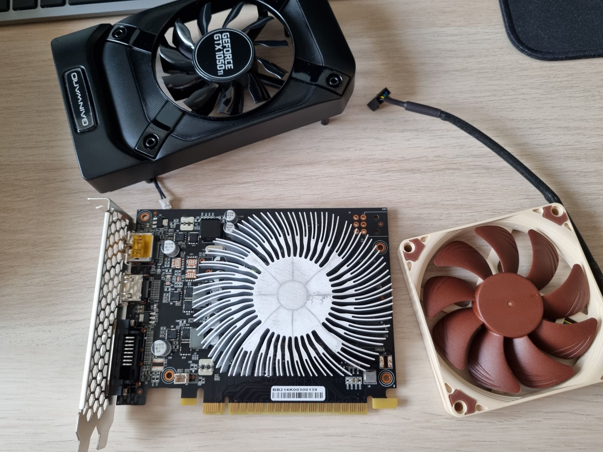 pořídil jsem si Gainward GTX 1050 Ti s jednám ventilátorem, ale je příliš hlučný. Minimální otáčky jsou nastaveny na 27% (míň to nejde, je to zamčené v BIOSU) a i tak je to skoro jako start rakety.