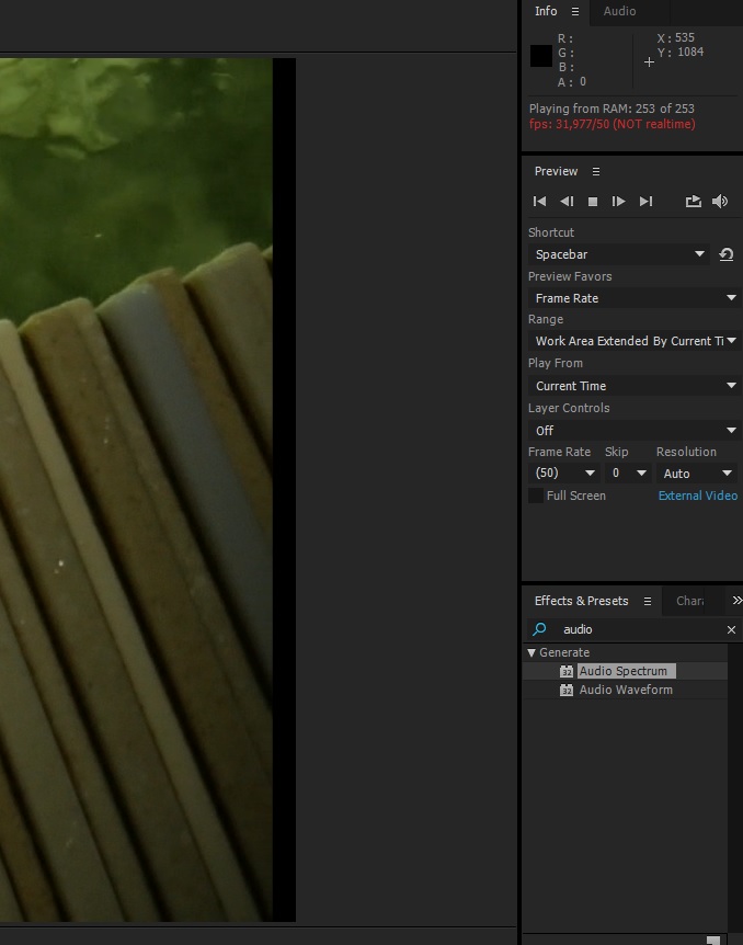 mám tuto sestavu Inter Core i5-4460, 3,20 GHZ, RAM 8GB, GeForce GTX960 a rád pracuji v After Effects (nemám to k práci) jen jako hobby, ale od určité doby nevím čím to může být, ale preview videa se načítá déle a hlavně i když se načte kompletně video a přehrává se tak nejde zvuk a napravo v rohu mi to stále píše, že preview neběží v reálném čase.