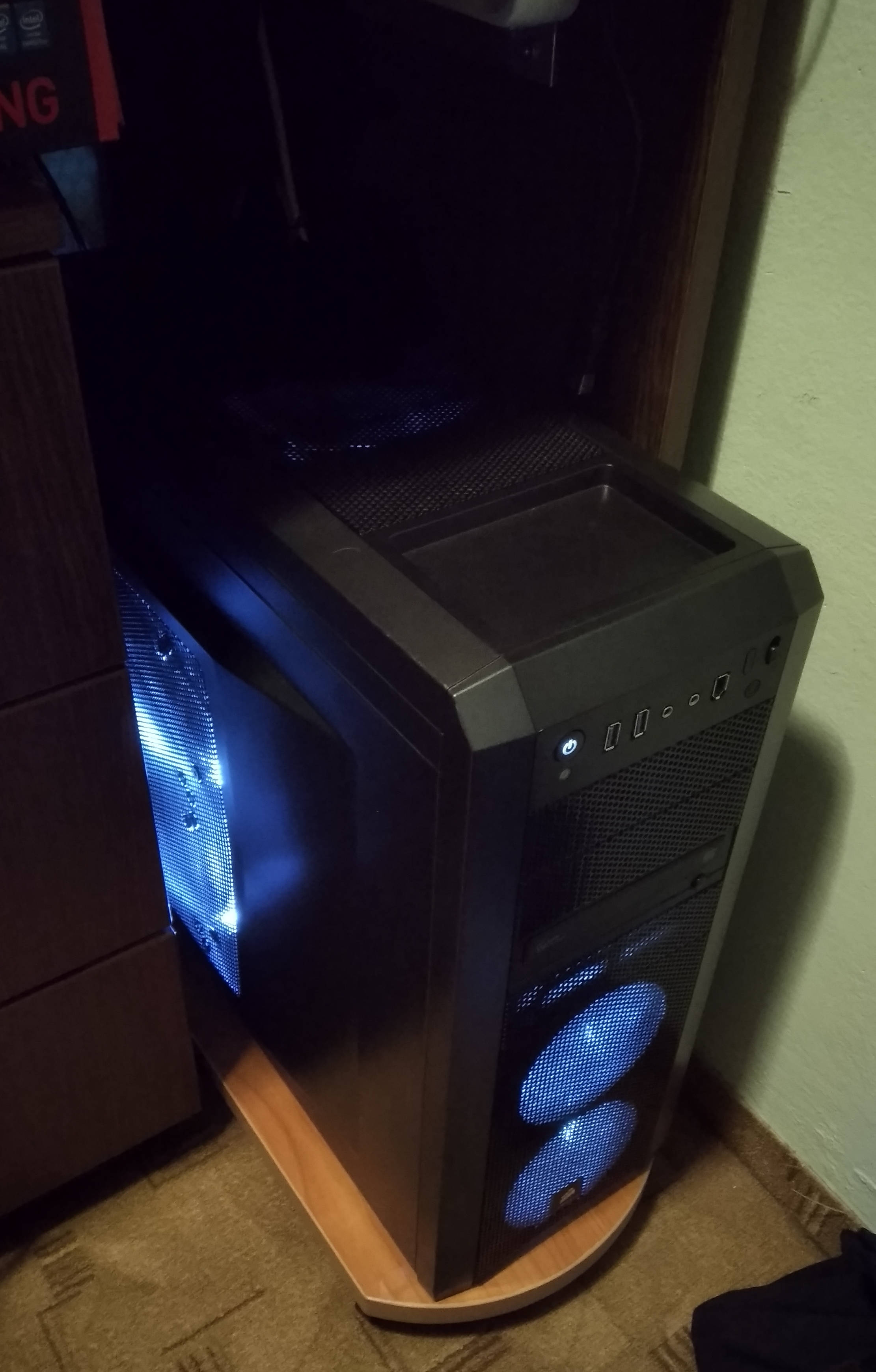 Jinak větráky v té Corsair500r mám jen základní - dva vpředu, jeden vzadu a jeden na boku. Na pr*el dostává hlavně tím, že je v tý malý místnosti a ještě k tomu ho mám vtlačenej mezi kontejnerem se šuplíky a bokem stolu, je takovej přidušenej, chudák... :cry: