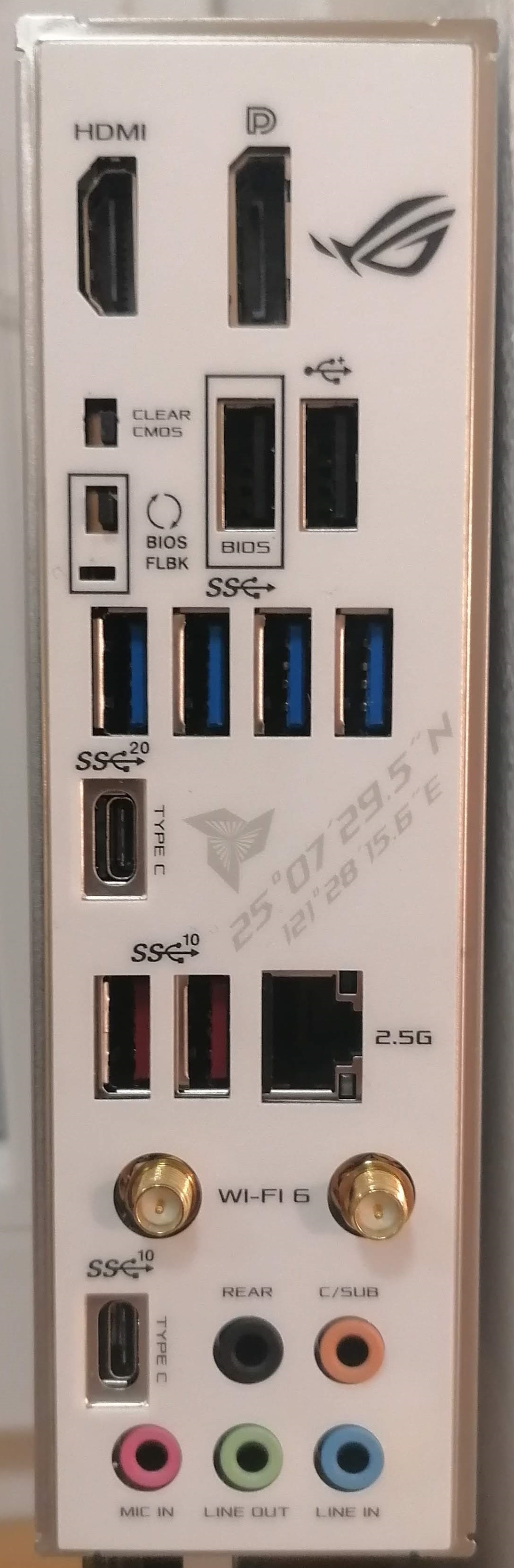Najdeme na něm 8x USB typu A , 2x USB typu C, HDMI, displayport, přípravu pro Wifi anténu 6.generace (anténa je součástí balení), RJ45 konektor, který je napojen na Intel 2,5Gbps síťovou kartu a 5x audio jack s 1x optickým výstupem napojené na nejnovější zvukový kodek ALC 4080, který je v Supreme FX provedení.