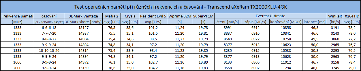 Pro chytrolíny, kteří si stojí za tím, že rychlejší paměť nelze pocítit jinde než v benchmarku, přikládám jeden test pamětí při různých kombinacích.