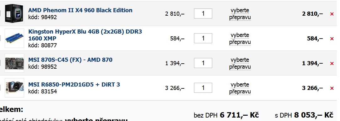 Promin GPU jsem přehlídl.Možná by bylo lepší koupit kvalitnější základ a na grafiku došetřit a doložit z prodeje původních součástek.Za 8000 bych šel do AMD http://www.czc.cz/amd-athlon-ii-x4-651/100191/produkt http://www.czc.cz/asus-f1a75-m-le-amd-a75/93726/produkt http://www.czc.cz/kingston-hyperx-blu-4 ... 77/produkt http://www.czc.cz/sapphire-hd-7770-ghz- ... 41/produkt U tyto sestavy bude mít zdroj velkou rezervu.Na kartě se dá trochu ušetřit prakticky stejný výkon a vyšší spotřeba http://www.czc.cz/msi-r6850-pm2d1gd5-di ... 54/produkt