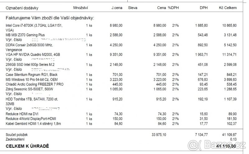můžete mi prosím někdo nastřelit cenu tohoto PC? Nechal jsem si ho složit pro práci (3D kreslení). Konfigurace na faktuře v příloze. PC je tři čtvrtě roku staré, běželo maximálně týden, pak jsem dostal firemní PC, tudíž je takřka nepoužité, překáží mi doma a chtěl bych ho pustit. Samozřejmostí je faktura, se zárukou, koupeno v kamenném obchodě, nákupní cena byla 41tis.