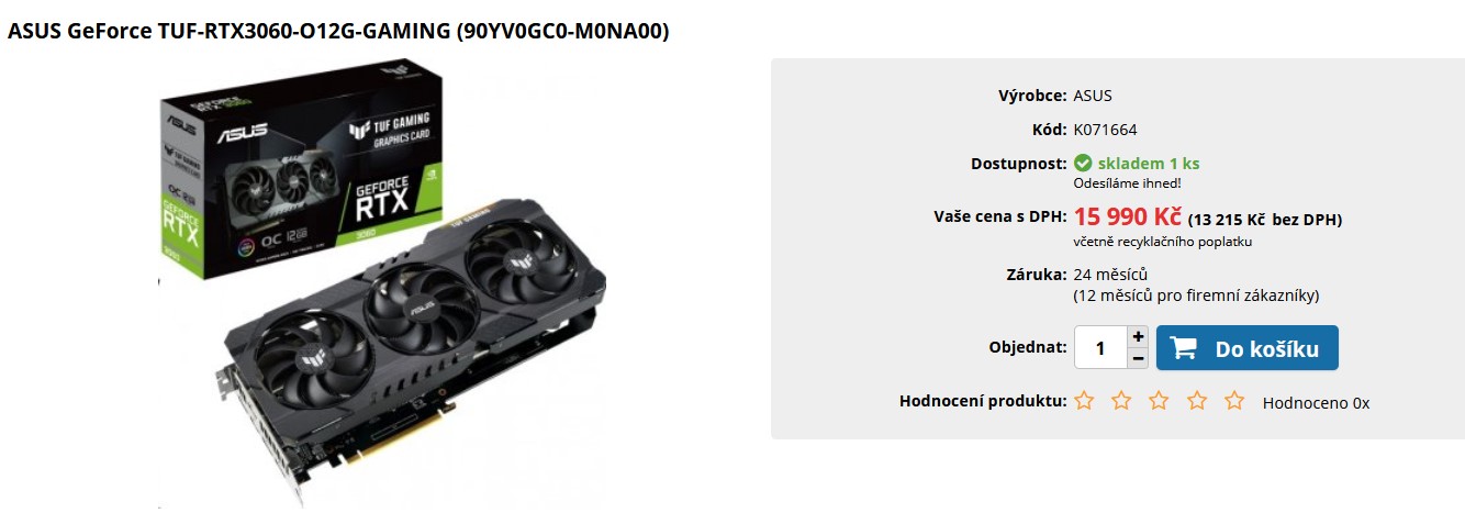 Dávat za RTX 3060 22K je nesmysl, výkon té karty je sotva na úrovni RX 5700 XT, která stála už před 2 lety polovinu. Sice jsou teď ceny dost našponované, ale i s přihlédnutím k tomu je ta cena dost otřesná a nezachrání to ani "nízká" spotřeba podobná RX 5700 a plno paměti, těch 12GB je navíc úplně k ničemu u něčeho tak slaboučkého.