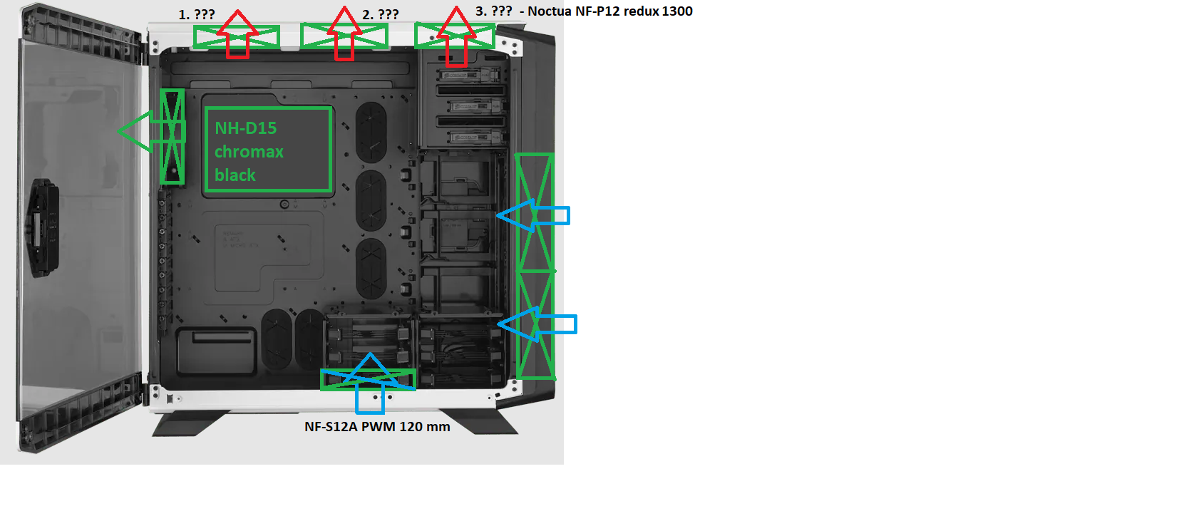 Nakoľko mám vodné chladenie Kraken x52, kde sú 2 fany, mal som hore ešte miesto, tak som tam použil nevyužitý Noctua NF-P12 redux 1300 - môžem tam tento fan nechať, alebo odporúčate ho dať preč a dať na miesto neho iný ? prípadne vymeniť ho s fanom, ktorý mám dole na case (NF-S12A PWM 120 mm) ? viď obrázok.