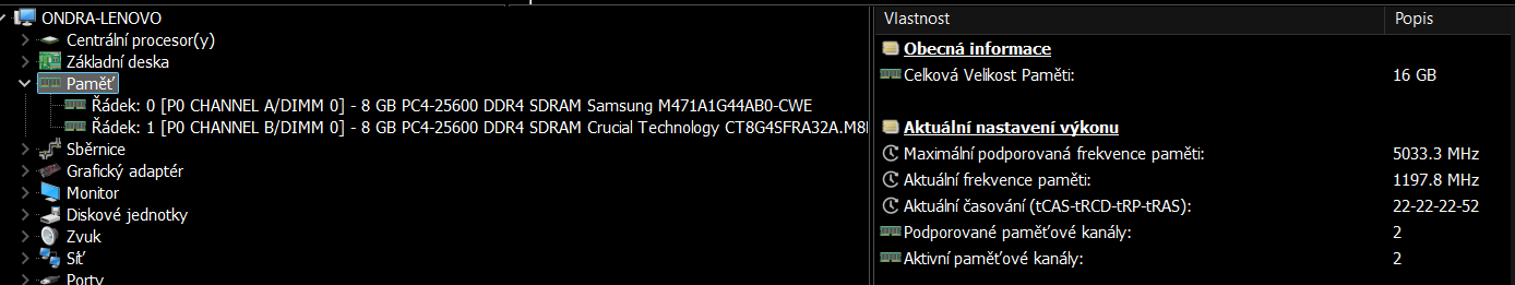Je otázkou, zdali tam nebude 8GB pájených na MB a dalších 8MB ve slotu (jak dnes bývá nehezkým zvykem) a nebo jestli tam jsou dva sloty. Pokud už se paměť rozšiřovala, je to v pořádku, ale pokud je to stav od výrobce, tak proč by se namáhal osazovat dva odlišné moduly RAM (různí výrobci)? Proto nevylučuji ani možnost, že je tam těch 8GB pájených. Pokud už máš vizuálně ověřeno, že jsou tam dva sloty, pak moje obavy ignoruj. Nové RAM nejlépe 3200 MHz,