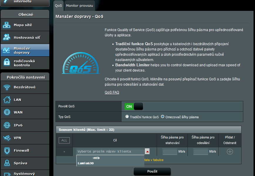 Manažer dopravy nabízí dvě volby - klasické QoS, kdy jsou přednostně doručovány pakety např. multimediálního obsahu a Omezovač šířky pásma, kde přímo omezíte šířku pásma libovolnému zařízení. Router nabídne k výběru připojené zařízení, lze ale vložit přímo MAC adresu, na kterou se omezení bude vztahovat.