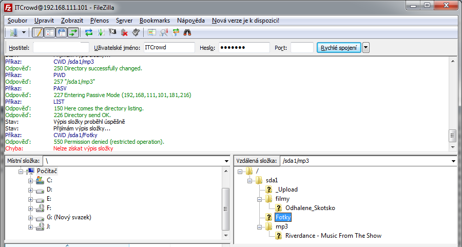 FTP server - jde o historické sdílení souborů (File Transfer Protokol). Slouží ke stahování souborů. Pro připojení je nutný FTP klient (zde FileZilla).
