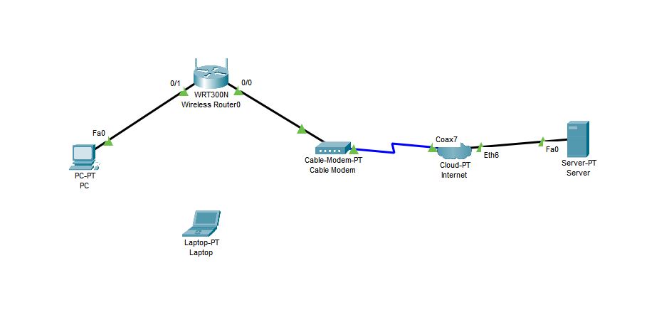 To co reprezentuje cloud (internet) je dajme tomu siet ineho poskytovatela / poskytovatelov. Z pohladu tvojej konfiguracie konci Cable Modemom ako hranicnym rozhranim a zaujma ta zasa az na porte Fa0 na servery. Co je medzi tim je starost inych spravcov siete.