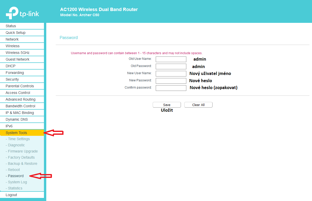 Tak si rozklikni v menu položku System Tools a tam Password.Zadáš najskôr staré meno a heslo a potom nové meno a heslo. Nové heslo ešte potvrdíš v poslednom riadku.
