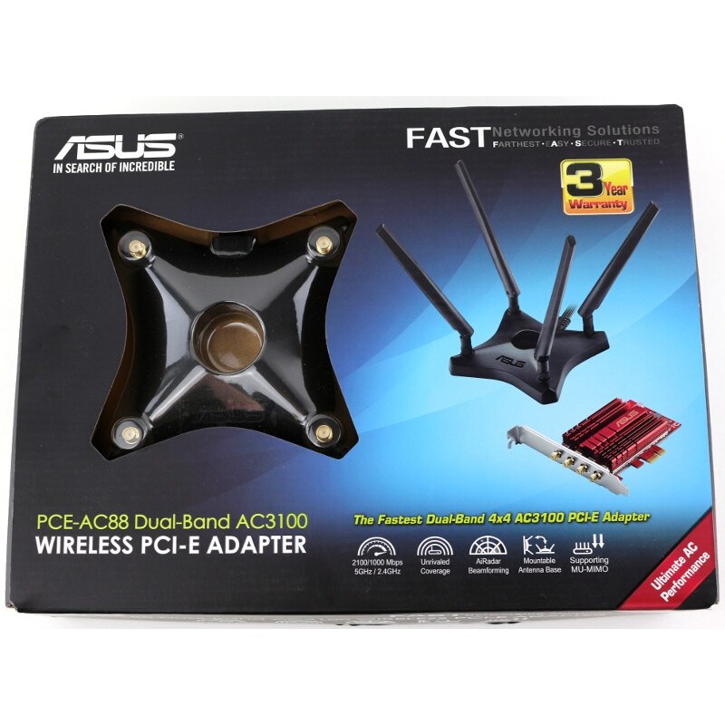 PCE-AC88 je dvoupásmová wifi PCI express karta pro desktopové počítače podporující nejnovější standard AC3100. Díky NitroQAM (1024-QAM) technologii dokáže tato karta pracovat s datovou propustností 2167 Mbps v pásmu 5 GHz a 1000 Mbps v 2,4 GHz pásmu, což nám celkově dává na papíře magickou hodnotu 3167 Mbps! Toto by mělo zaručit bezproblémovou propustnost pro streamování ve vysokém rozlišení a nízkou latenci i pro počítačové nadšence při hraní online titulů, kde se každá milisekunda hraje roli. PCI-AC88 byla v době vydání, a i v současnosti jedna z mála (čti jediná) PCIe karta, která tento standard podporuje. Oproti klasickým 3x3 adaptérům (levnější sourozenec z rodiny Asus PCE-AC68) zde dosahujeme až o 60 % zlepšení. Adaptér je osazen čtveřicí výkonných antén v režimu 4x4. Označení 4x4 představuje 4 antény pro příjem a 4 antény pro odesílání signálu. Tím je zajištěna nejen vyšší rychlost a intenzita signálu, ale také vyšší pokrytí a vyšší stabilitu.