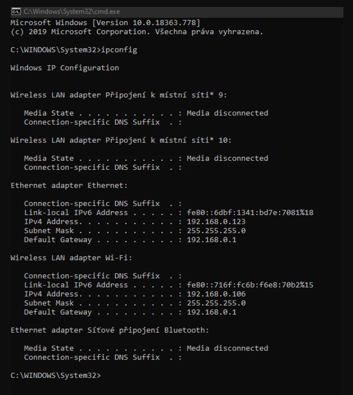 prosím o úplný výpis - tedy příkaz "ipconfig -all".