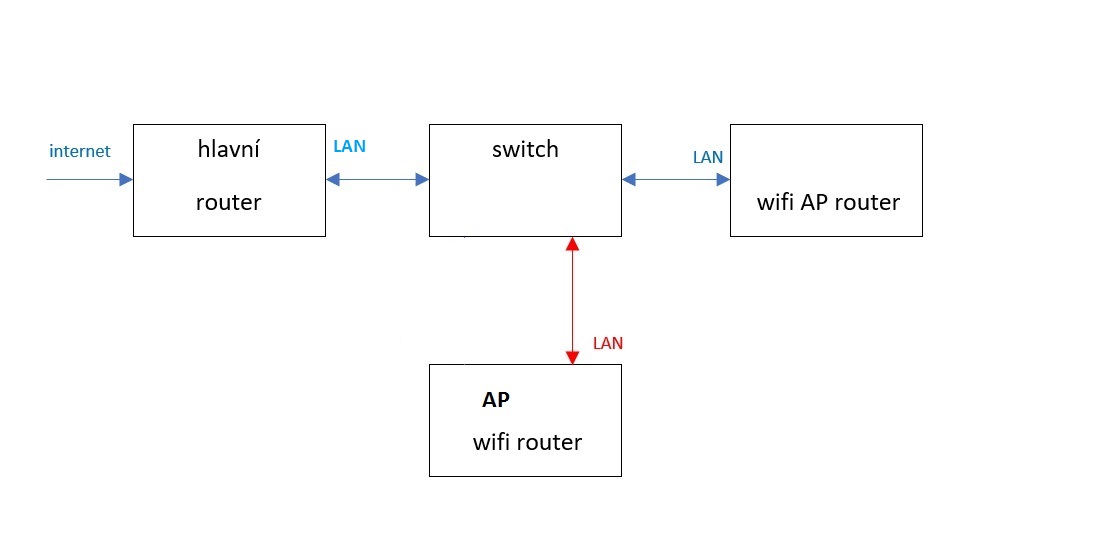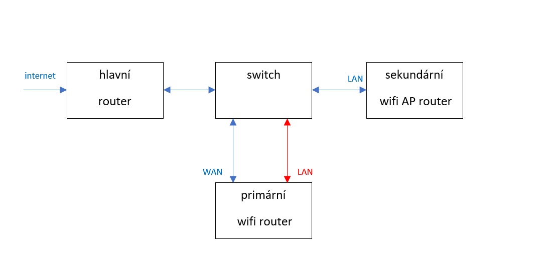 Prosím tě, přikládám nákres, ten Primární wifi router mám mít propojený do switche jen přes WAN (modrý propoj)? Nebo jen LAN (červený propoj)? Nebo přes WAN i LAN zároveň (modrý i červené propoj)?