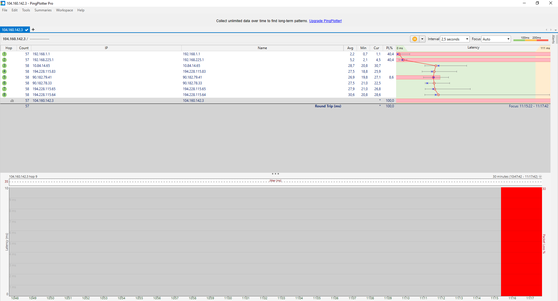 No, už na prvním hopu je 40% ztracených paketů. Totéž na 2. hopu, takže to ani pořádně fungovat nemůže.