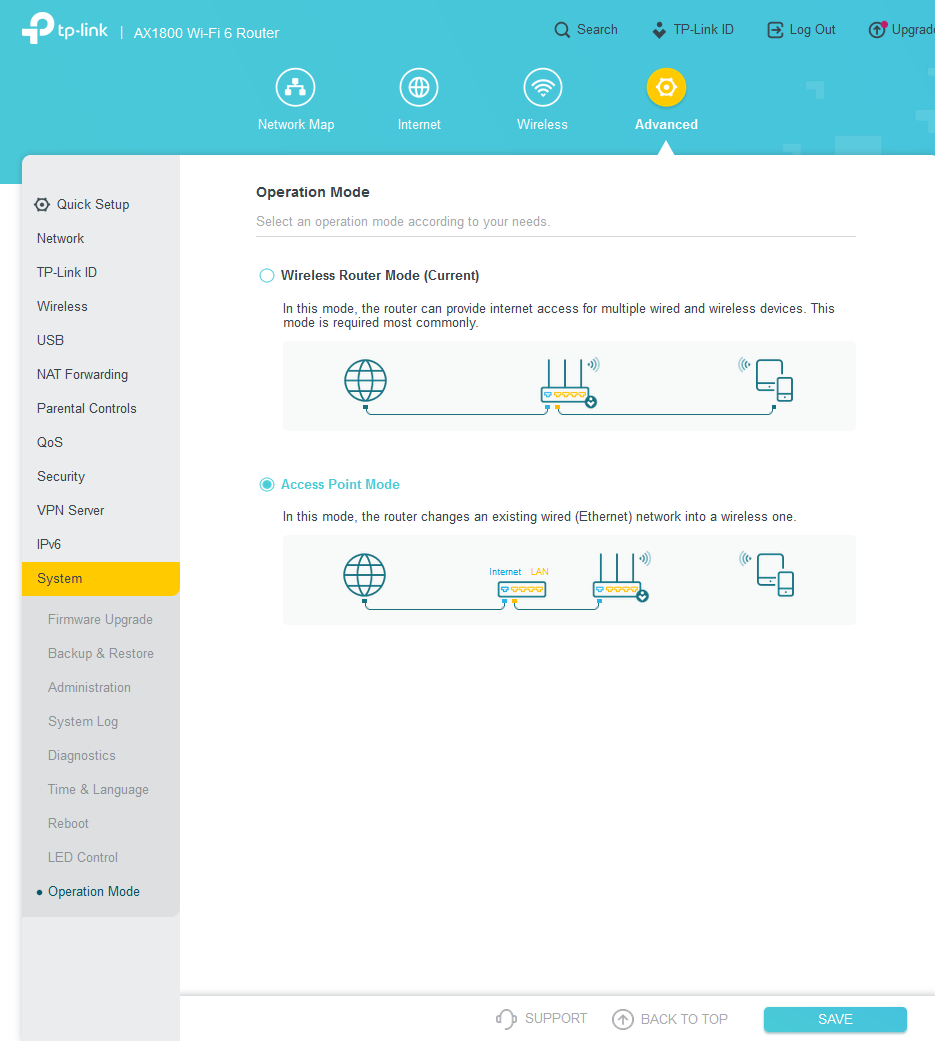 Ten tplink umí AP mód. tedy postačí nastavit DHCP na disabled a přepnout ho do AP módu (viz. obrázek).
