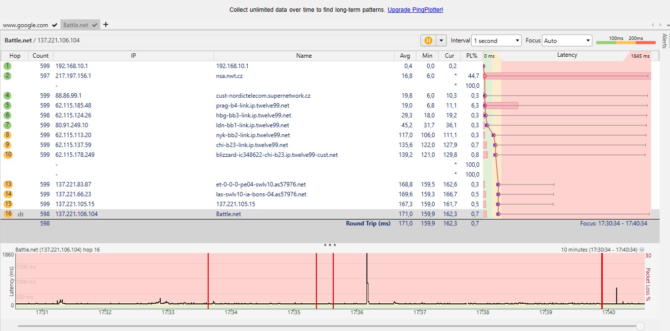 Zdravím, poslední dobou mi z ničeho nic začal skákat ping a packet loss. Bohužel jsem v sítích laik, ale zkusil jsem battle.net na pingplotteru. Já tomu programu až tak moc nerozumím, ale znamená ten 48% packet loss, že je problém u mě.?
