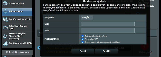 AiProtection - Routery Asus spolupracují s TrendMicro. Na základě informací z jejich databáze dokáží zablokovat škodlivé stránky, nebo identifikovat napadené zařízení ve vaší síti. Také hned uvidíte potenciální hrozby:AiProtection umí poslat výstrahu na e-mail: