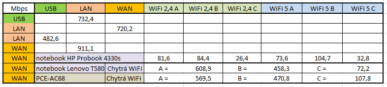 Při testech jsem narazil na zvláštnost - ne vždy je výhodou nejbližší vzdálenost. A dále - můj HP probook s protokolem 802.11n jsem nepřemluvil k vyšší rychlosti, byť jsem se o to snažil všemožným nastavením. Ovšem úplně jinde byly rychlosti s Lenovo T580 s kartou podporující 802.11ac. Tam jsem byl opravdu překvapen. Navíc v prostoru "A" byl notebook dokonce rychlejší, než karta PCE-AC68.