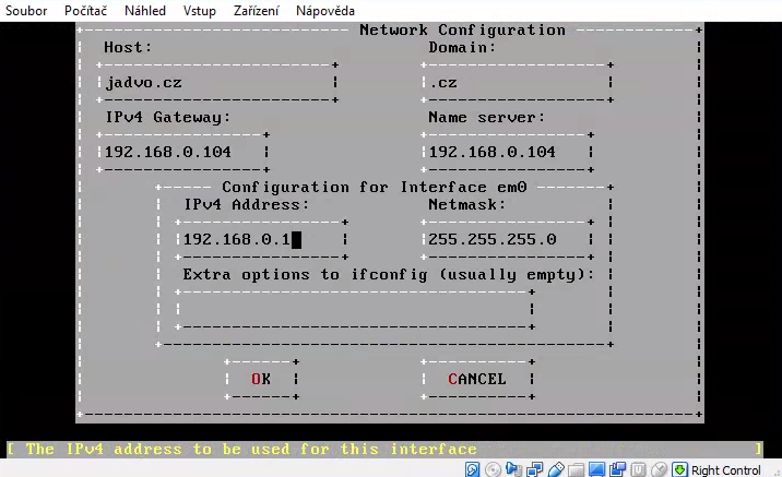Zde nastavení BSD Nastavením IPv4 protokolu u VirtualBoxu jsem se nezdržoval neboť je vytvořený most mezi 192.168.0.101 a VB, tedy teoreticky mezi .101 a .104.