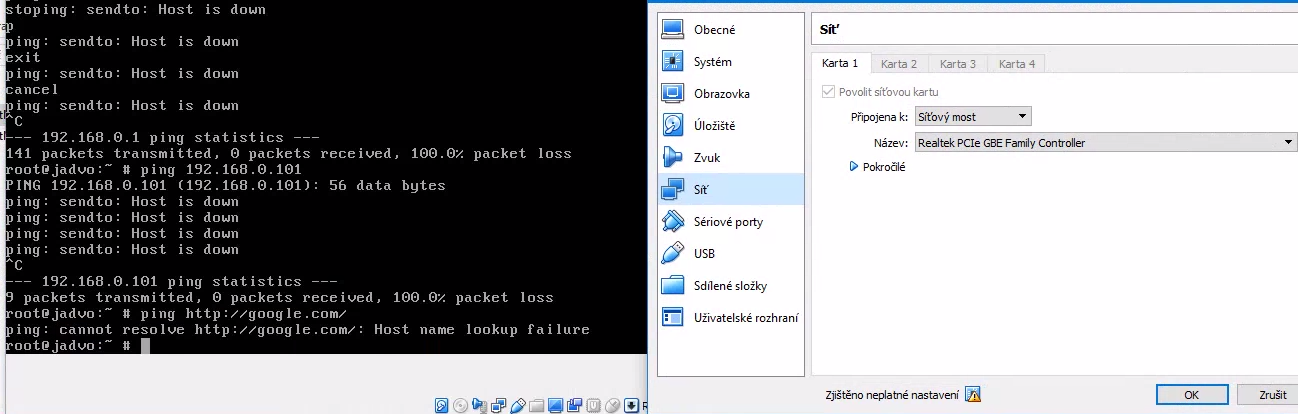 Jinak používám Oracle VM VirtualBox a v nastavení virtuálního serveru mám nastaveno, že Sít: Síťový most -> Síťová karta počítače (.101), takže nevidím jediný důvod, proč mé nastavení nefunguje.