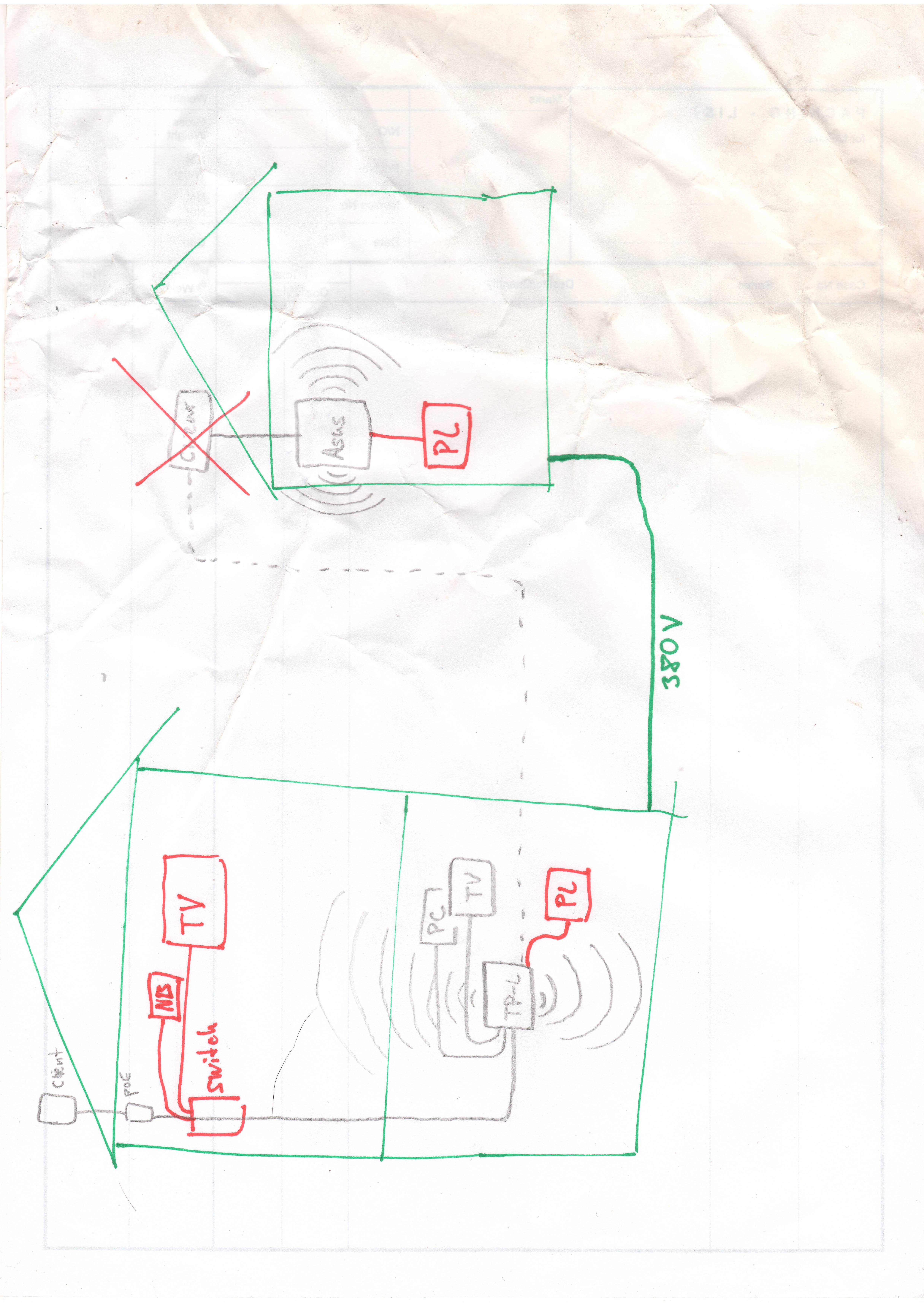Aktuálně (zakresleno tužkou) mám připojení přes 5GHz clienta na střeše, z něj ethernet do přízemí, kde je TP-link N750, k tomu je drátově připojená jedna TV, PC a tiskárna. Bezdrátově pak komunikuje se starým 2,4 clientem (Ubiquiti nanostation 2 loco), který je na střeše zděné dílny (3 fáze taženy z domu), na ten je připojen AP (Asus WL500g deluxe), který pokrývá zahradu.