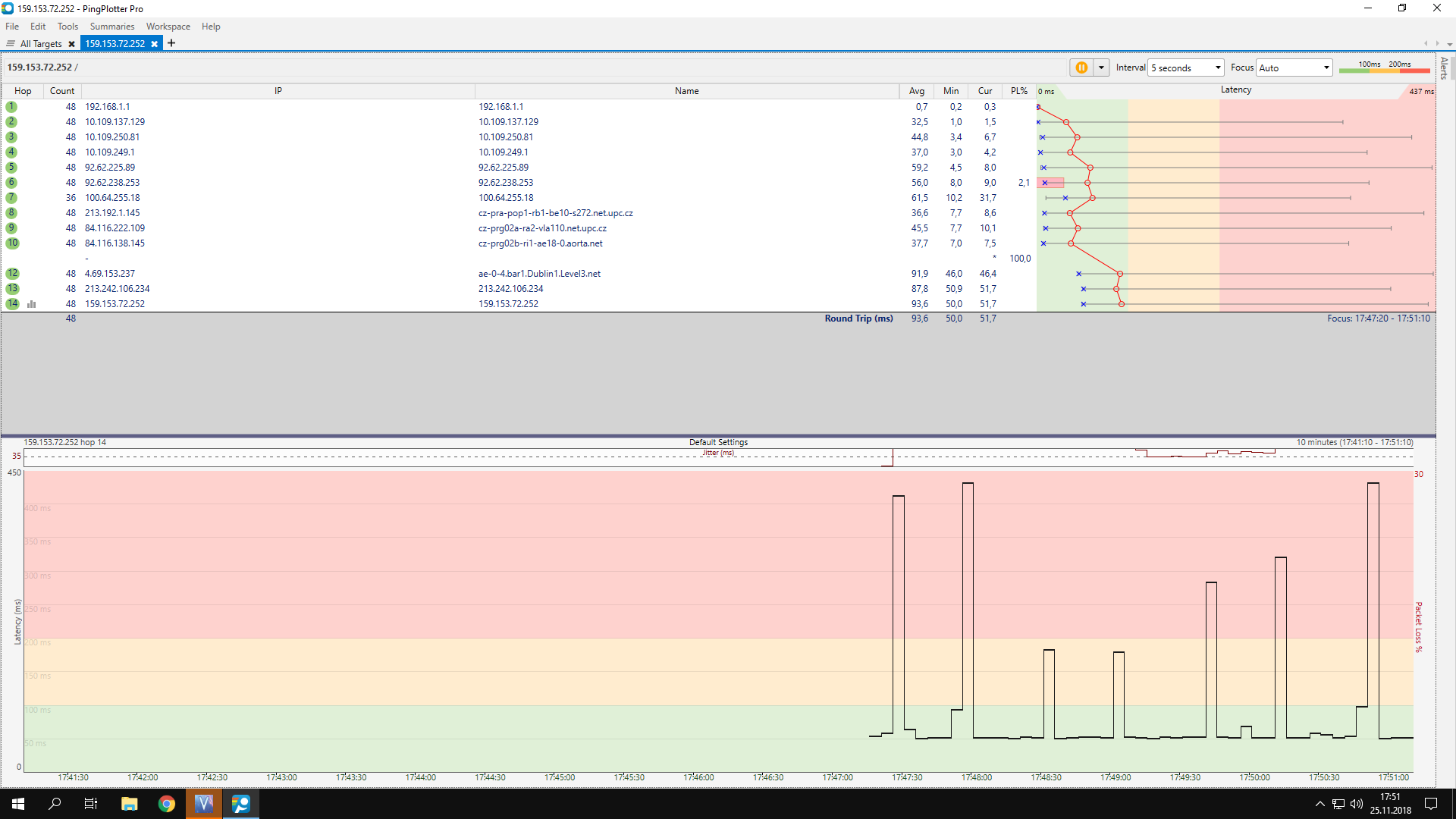 Vlož sem screen z programu PingPlotter. Taky můžeš napsat jaký typ připojení máš a jakou konektivitu, poskytovatele.
