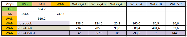 Co je ovšem vynikající je spojení s kartou PCE-AX58BT. Router nastaven na inteligentní WiFi (pouze jeden SSID pro obě pásma), povolena šířka pásma 160 MHz a jinak vše na automatiku. Z tabulky je patrné, že propustnost WAN->WiFi je téměř stená jako WAN->LAN. Spostupující vzdáleností se hodnoty pochopitelně snižují, i tak jsou bezkonkurenční.