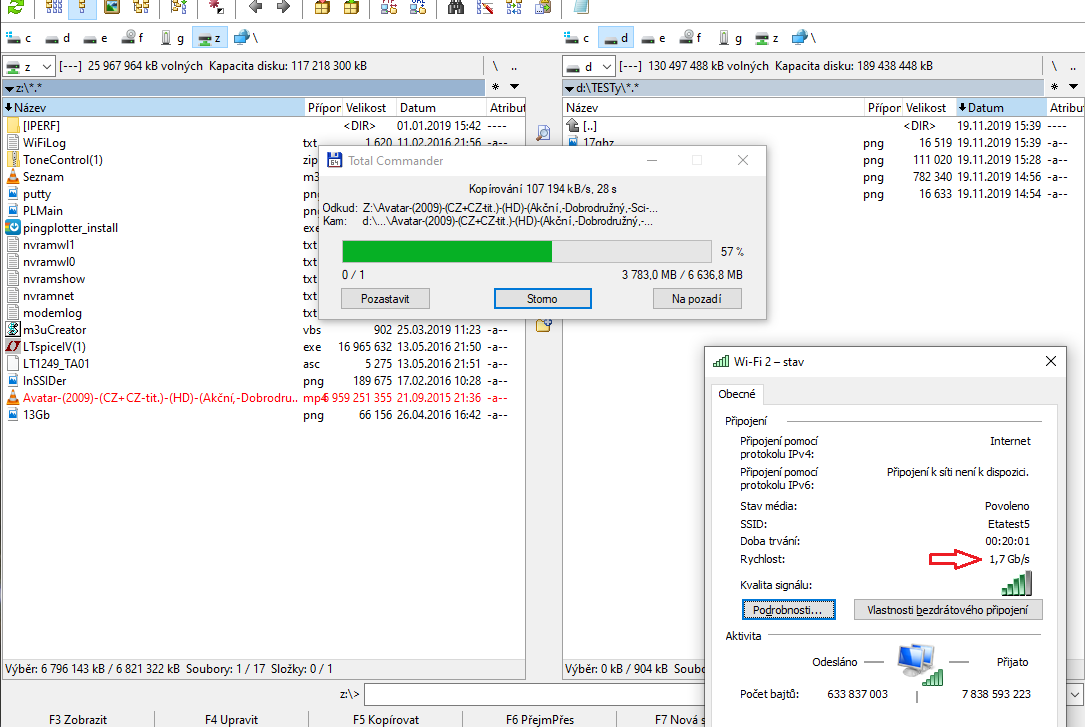 Zde se můžete přesvědčit, že reálná rychlost kopírování souboru je 107 MB/s, což je srovnatelné s gigabitovou LAN sítí (kabel). A všimněte si navázané rychlosti spojení - 1,7 GHz!