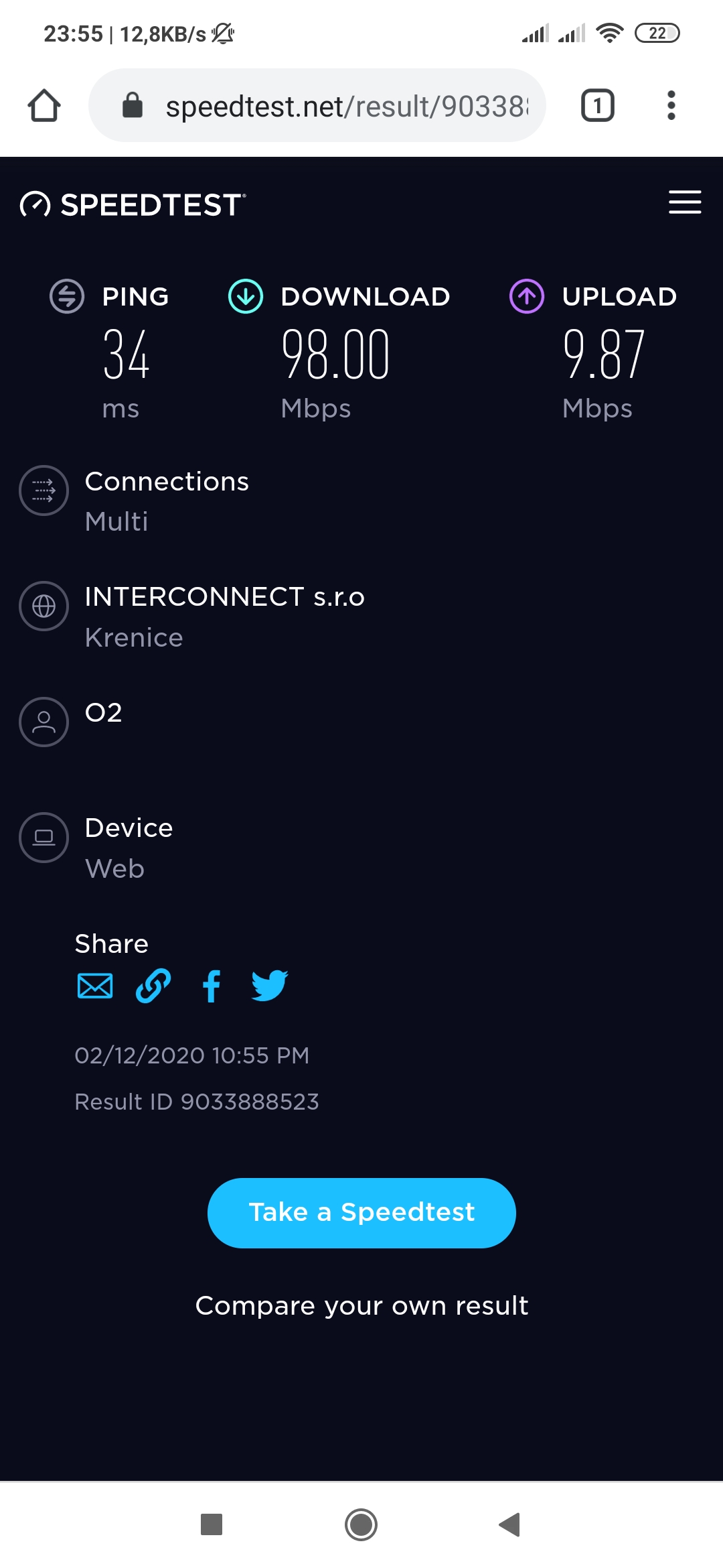 Mám problém s rychlostí internetu na pc, které je připojené kabelem. Když udělám test rychlosti na telefonu, tak je vše v pořádku.Přikládám foto.